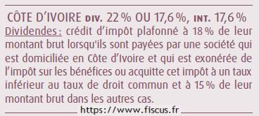 - Côte d’Ivoire: Les revenus de source française sont exemptés des impôts ivoiriens lorsqu’ils sont passibles en France de l’impôt sur le revenu ou de l’impôt sur les sociétés. Pour les dividendes, intérêts, redevances, rémunérations d’administrateurs, revenus d’artistes et sportifs, l’impôt perçu en France n’est pas déductible pour le calcul du revenu imposable en Côte d’Ivoire, mais l’impôt ivoirien est calculé sur le montant de ces revenus diminué d’un abattement forfaitaire (variable selon le type de revenu) et un crédit d’impôt est accordé, égal à l’impôt français.