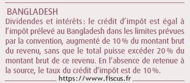- France: Exonération des revenus qui sont imposables au Bangladesh (avec prise en compte de ces revenus pour le calcul du taux effectif d’imposition). Crédit d’impôt pour les dividendes, intérêts, redevances, égal au montant de l’impôt payé au Bangladesh, dans la limite de l’impôt français correspondant à ces revenus.