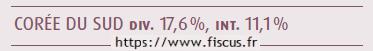 - France: Exonération des revenus qui sont imposables en Corée (avec prise en compte de ces revenus pour le calcul du taux effectif d’imposition). Crédit d’impôt pour les dividendes, intérêts, redevances, égal au montant de l’impôt payé en Corée, dans la limite de l’impôt français correspondant à ces revenus.