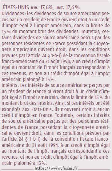 • France: Exonération des revenus qui sont imposables aux États-Unis (avec prise en compte de ces revenus pour le calcul du taux effectif d’imposition). Crédit d’impôt pour les dividendes, intérêts, redevances, égal au montant de l’impôt payé aux États-Unis, dans la limite de l’impôt français correspondant à ces revenus.