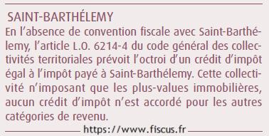 Saint-Barthélemy D’après la convention fiscale France/Saint-Barthélemy, les crédits d’impôt conventionnels pour les dividendes et intérêts, pour un résident Français recevant des revenus de Saint-Barthélemy, sont : Crédit d’impôt pour les dividendes : 0% Crédit d’impôt pour les intérêts : 0%